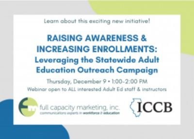 November 4, 2021Registration is open for the first Outreach PD webinar, “Raising Awareness & Increasing Enrollments: Leveraging the Statewide Adult Education Outreach Campaign.” Registration is open to ALL staff and instructors employed by ICCB-funded adult education programs. Register here!